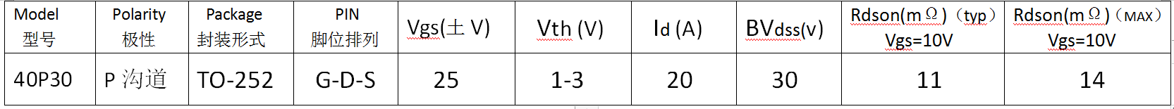 為了解決電子工程師在設計電源的時候能提高過流保護的功能,飛虹電子研發(fā)了型號為40P03的MOS管,采用P溝道溝槽工藝,封裝形式為TO-252,腳位排列是G-D-S,mos管廠家其他參數(shù)請看下圖: