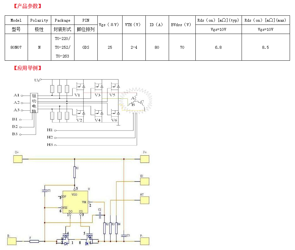 在80A、70V的大電流、低壓MOS管型中,推薦這一款純國產的80N07型號來應用于電動車行業中的控制器跟鋰電池保護板的電路中。