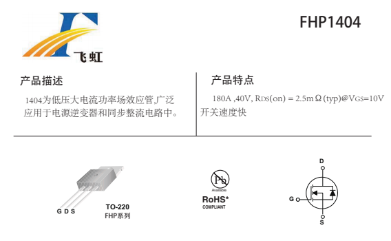 FHP1404的主要封裝形式是TO-220,腳位排列位GDS。這款1404場(chǎng)效應(yīng)管產(chǎn)品具體參數(shù):Vgs(±V):25;VTH(V):2.5-4;ID(A):180;BVdss(V):40。RDS (on) = 2.5mΩ(typ)@V GS =10V,180A大電流40V電源MOS管開關(guān)速度快。