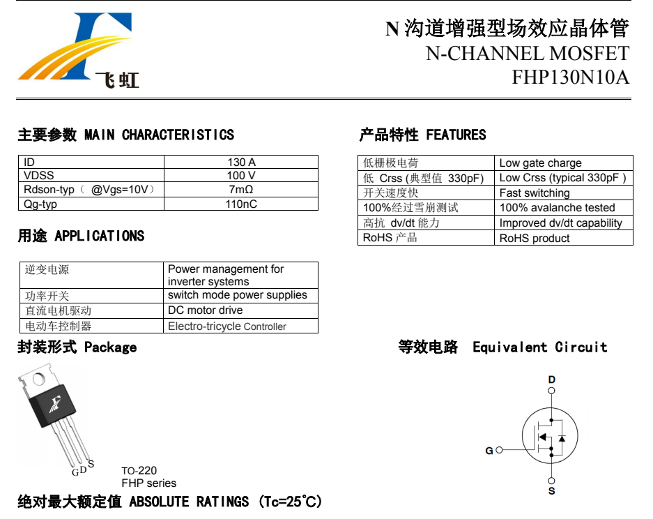 FHP130N10A的主要封裝形式是TO-220。這款產品參數:Vgs(±V):25;ID(A):130A;BVdss(V):100V。