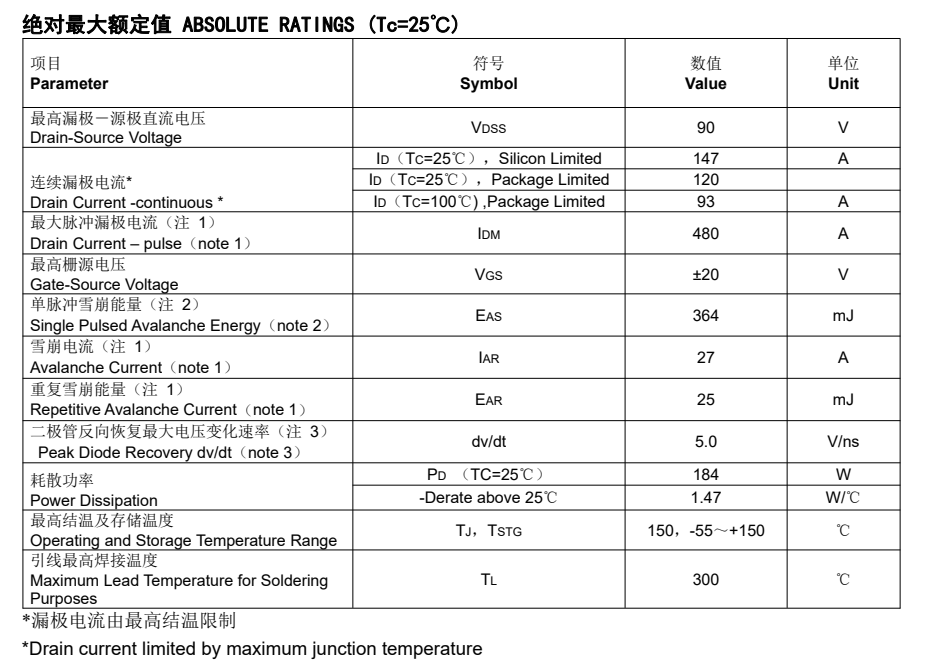 具有140A、100V的電流、電壓, RDS(on) = 6.2mΩ(max) ,最高柵源電壓@VGS =±25V,內阻小,抗過電流能力好的特點。
